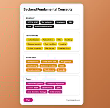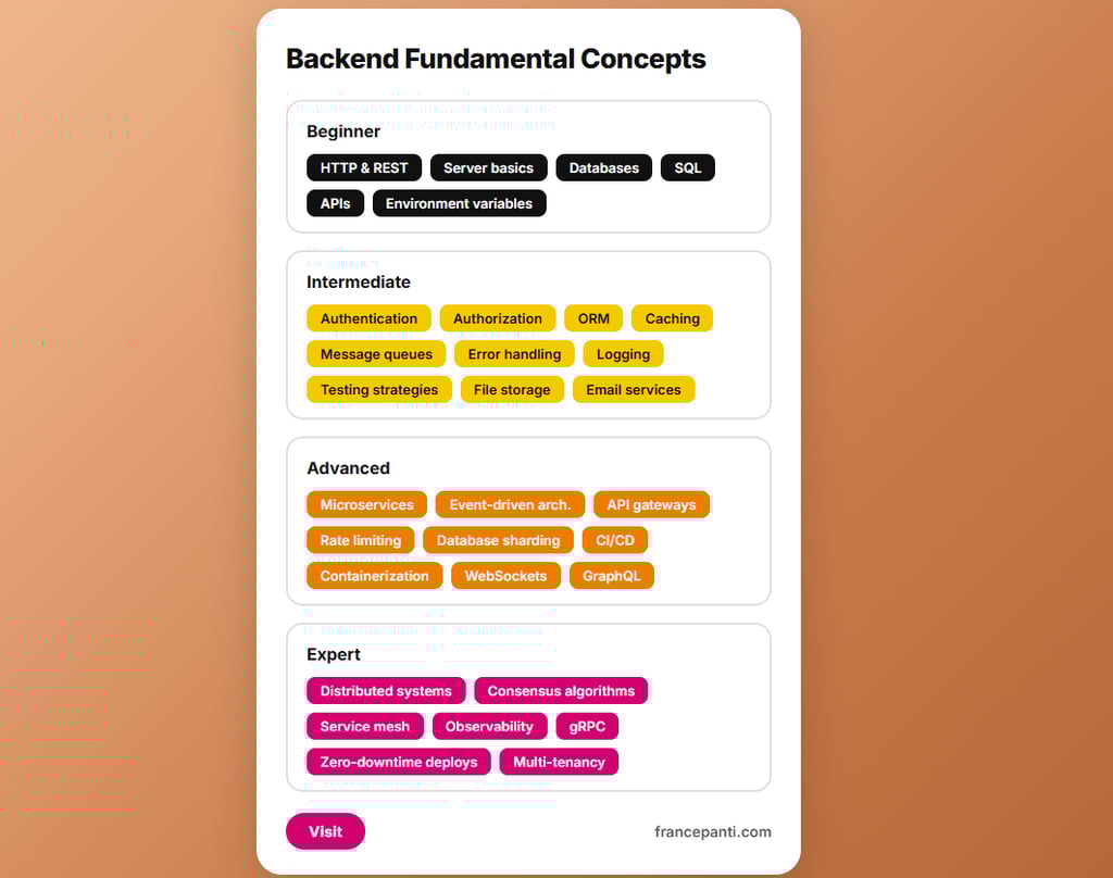 Tu veux apprendre le backend de manière structurée sans te perdre dans des tutoriels dispersés ? Dans cet article, je te partage une roadmap complète du développement backend, organisée par niveaux : débutant, intermédiaire, avancé et expert. Tu y découvriras les compétences essentielles à maîtriser à chaque étape — des bases HTTP et SQL jusqu’aux systèmes distribués et architectures scalables. Que tu sois étudiant, développeur junior ou professionnel souhaitant renforcer ses compétences, cette feuille de route t’aidera à progresser avec méthode et clarté. 👉 Lis l’article et construis ta montée en compétence étape par étape.